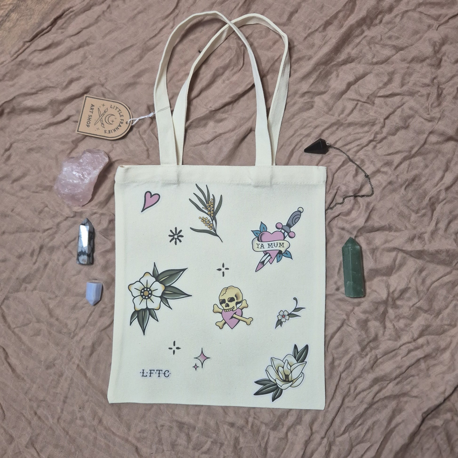 Hand-decorated on both sides - with tattoo-inspired flash from Little Frankie’s Tattoo Co., each bag features a one-off sticker arrangement, making it as individual as you are.