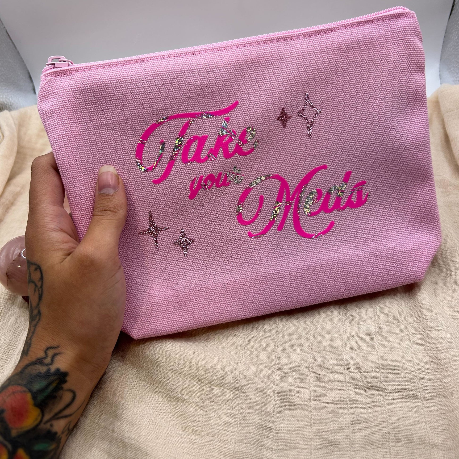 Each pouch is hand-stamped with a long-lasting, washable transfer - with a one-of-a-kind design.